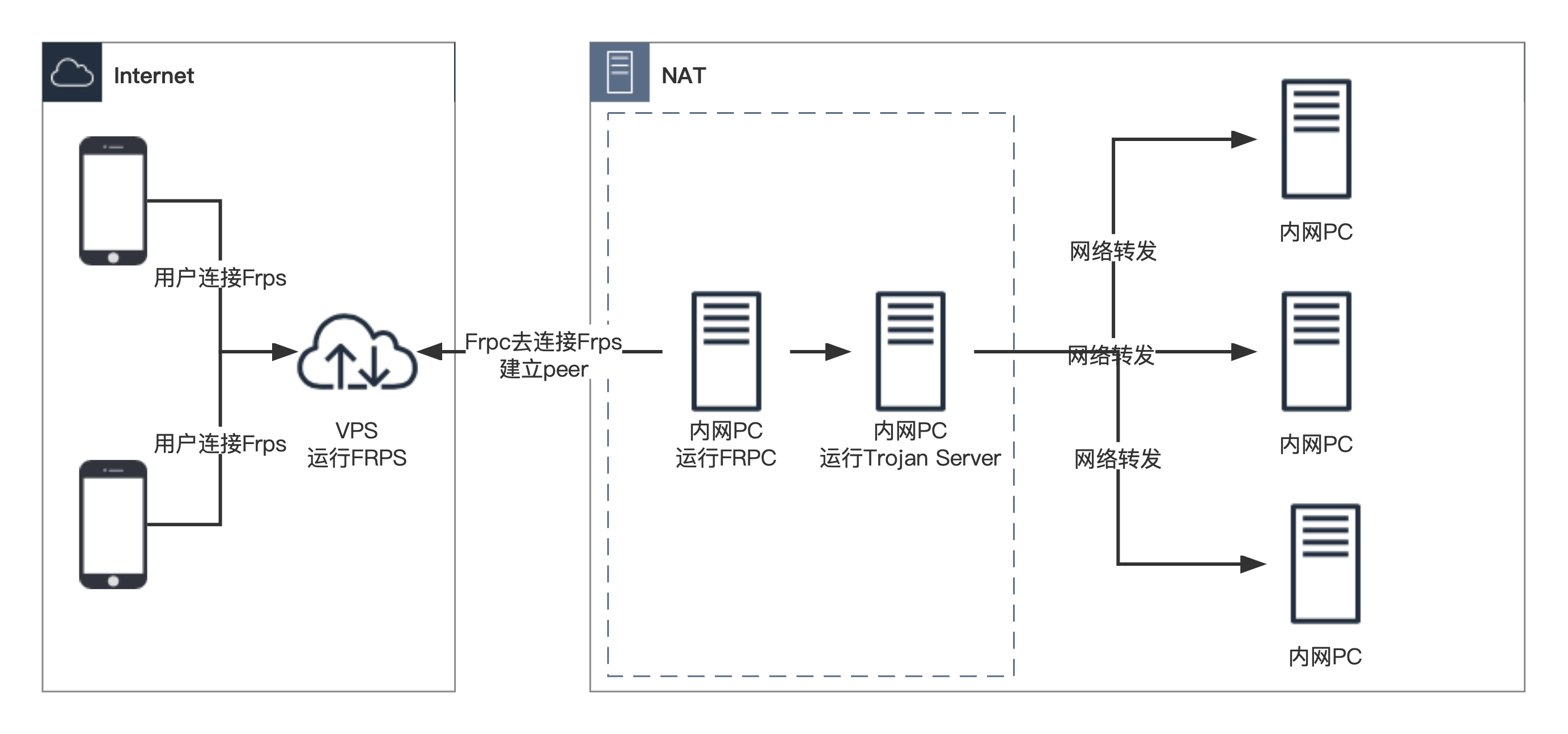 Frp解决了把局域网的端口暴露成VPS公网端口,那么如果我们在局域网安装一个 Trojan,只要把 Trojan 的端口通过 Frp 暴露出去,那么 Trojan 就可以被公网访问了